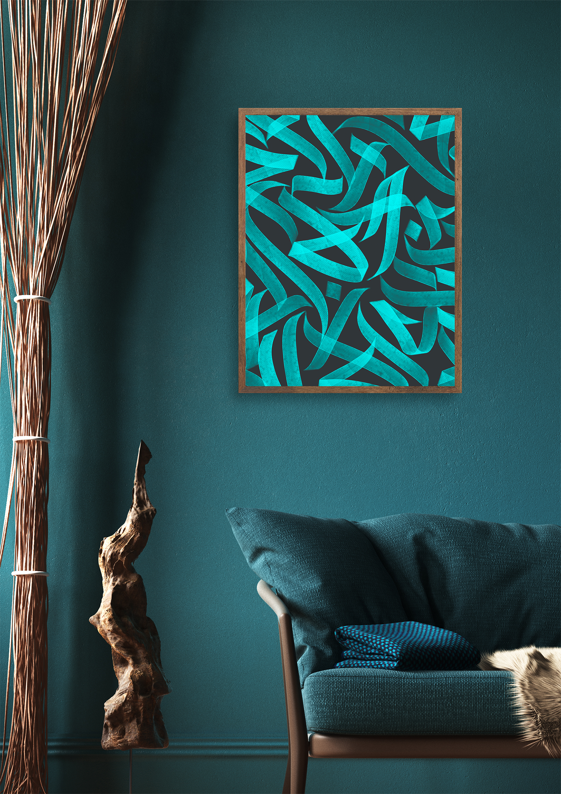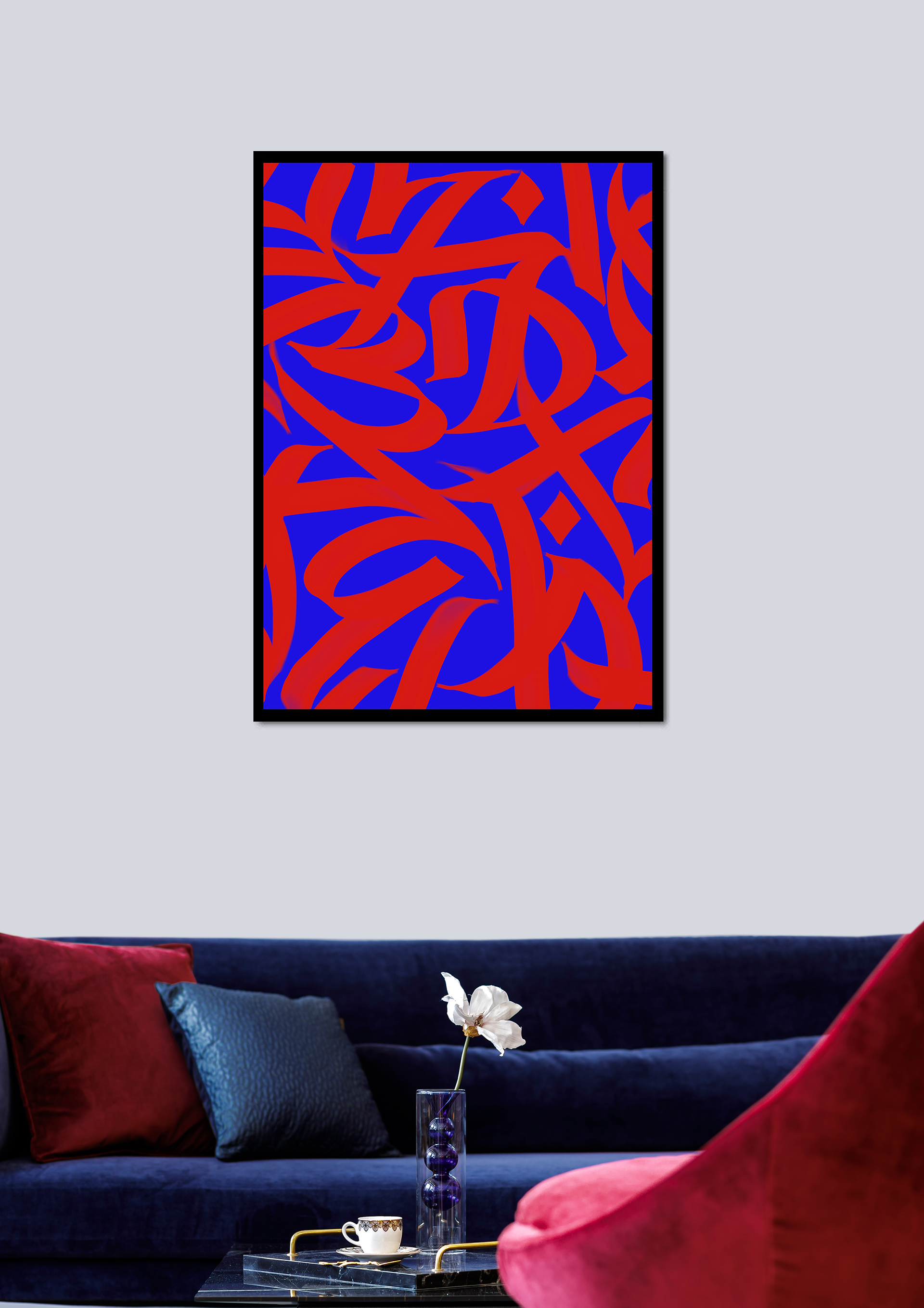 The utilities depend on you. What you want to do with it, how you want to use it, where you want to put it its all up to you. This rewards you as the co-creator of Asemic Rhythm. You as the holder/owner has the right to use the work for personal and commercial use. Below is an example of the work printed and framed for your interior needs to lived up your space and aesthetics.